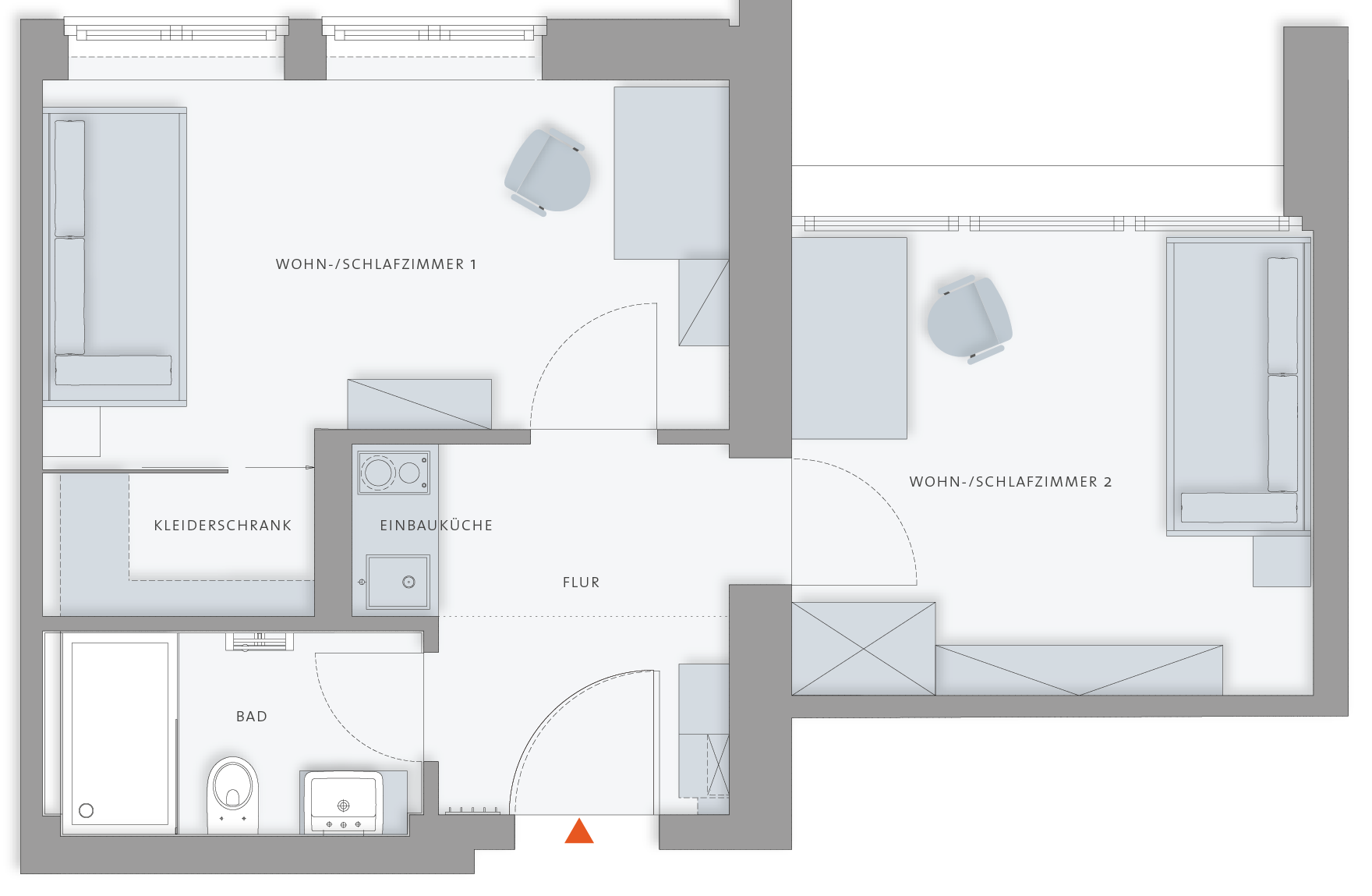 Dank der modern eingerichteten Apartments ist ein Einzug jederzeit ohne großen Aufwand möglich. Die Apartments verfügen über eine eigene Pantry mit Spüle, Ceran-Kochfeld, Mikrowelle, Kühlschrank, ausreichend Stauraum sowie ein eigenes Bad mit WC und Dusche. Die zweckmäßige Möblierung vereinfacht den Umzug für die Mieter und bietet somit einen erheblichen Mehrwert.